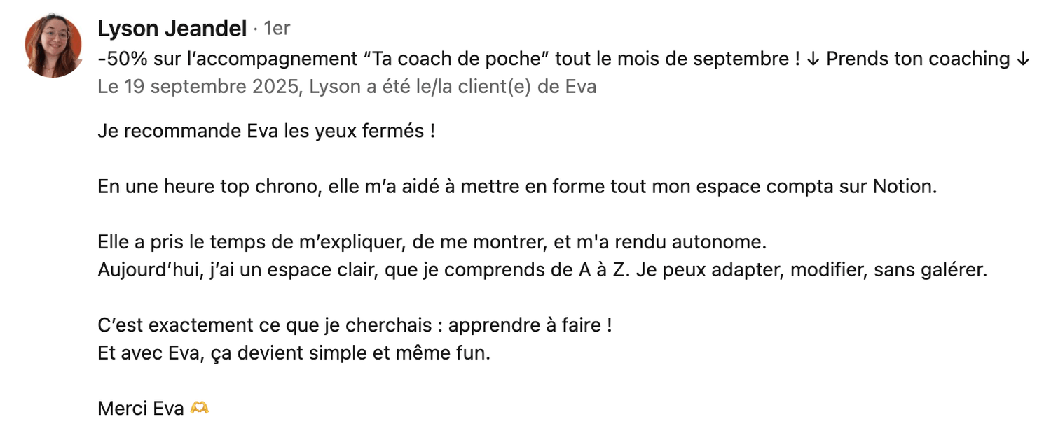 À la fin, tu repars avec un espace Notion qui tourne pour toi, et surtout les compétences pour le faire évoluer dans le temps.